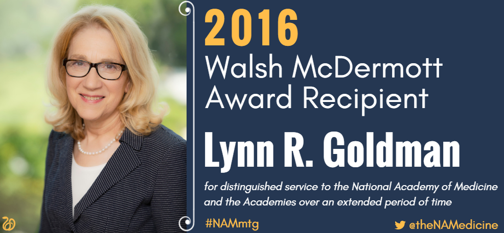 The National Academy of Medicine awards the Walsh McDermott Award annually to a National Academy of Medicine member for distinguished service to the National Academies over an extended period of time. Dr. Lynn Goldman, dean and professor of environmental and occupational health the Milken Institute School of Public Health at The George Washington University, received the 2016 award for her nearly-30-year history of volunteer service. In the following interview, Goldman discusses how she got her start in environmental health, why she chooses to volunteer with the National Academies, and why the perspective of people early in their careers is so crucial to advancing science and health.