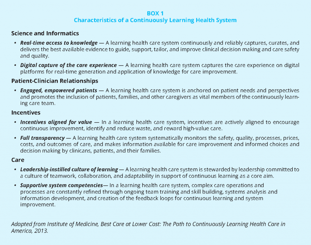 Beyond payment reform emphasizing health care value, opportunities to address the challenges facing modern health care can be found within a continuously learning health system, a bidirectional approach to learning in which the care delivery process creates new knowledge and care is adapted in response to knowledge generated. The Institute of Medicine (IOM, 2013) report Best Care at Lower Cost: The Path to Continuously Learning Health Care in America laid out a vision for a continuously learning health system, stating that: “The committee believes that achieving a learning health care system—one in which science and informatics, patient-clinician partnerships, incentives, and culture are aligned to promote and enable continuous and real-time improvement in both the effectiveness and efficiency of care—is both necessary and possible for the nation.” As shown by this vision (see Box 1) a continuously learning health system offers the promise of creating new knowledge, returning data to clinicians and patients to guide care, making progress in how person-centered care is delivered, reducing costs, and creating value for those served.