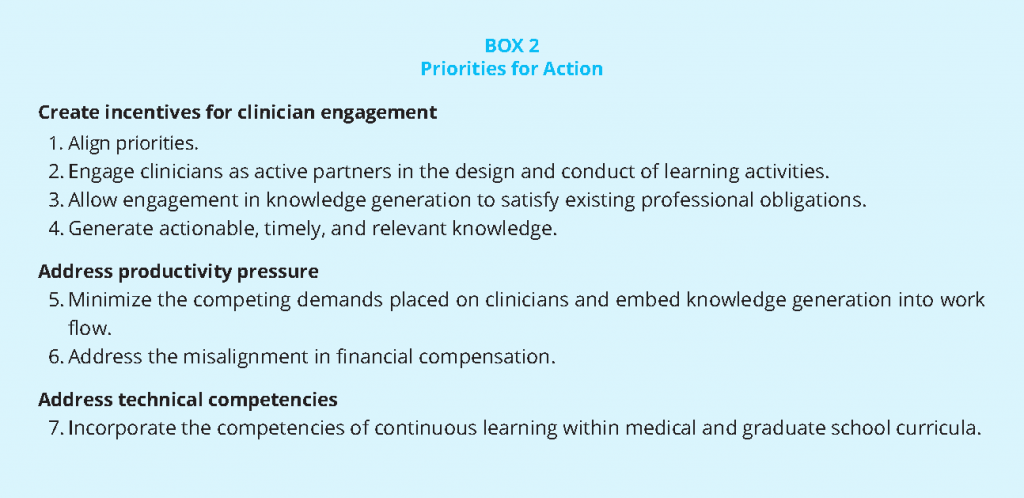 The priorities for action, which are articulated below (see Box 2), will require commitment by multiple stakeholders to transform how clinicians engage with, are rewarded for, benefit from, and are included in knowledge-generation initiatives. The charge to create new evidence that improves clinical care does not belong solely in the realm of research. We believe that clinician engagement in the learning health system is an issue of professionalism; it is the intellectual responsibility for members of the clinical team—those people involved in the day-to-day practice of health care delivery—to generate knowledge and improve care (AMA, 2016). The American Medical Association Code of Medical Ethics Principles V and VII speak directly to this responsibility: