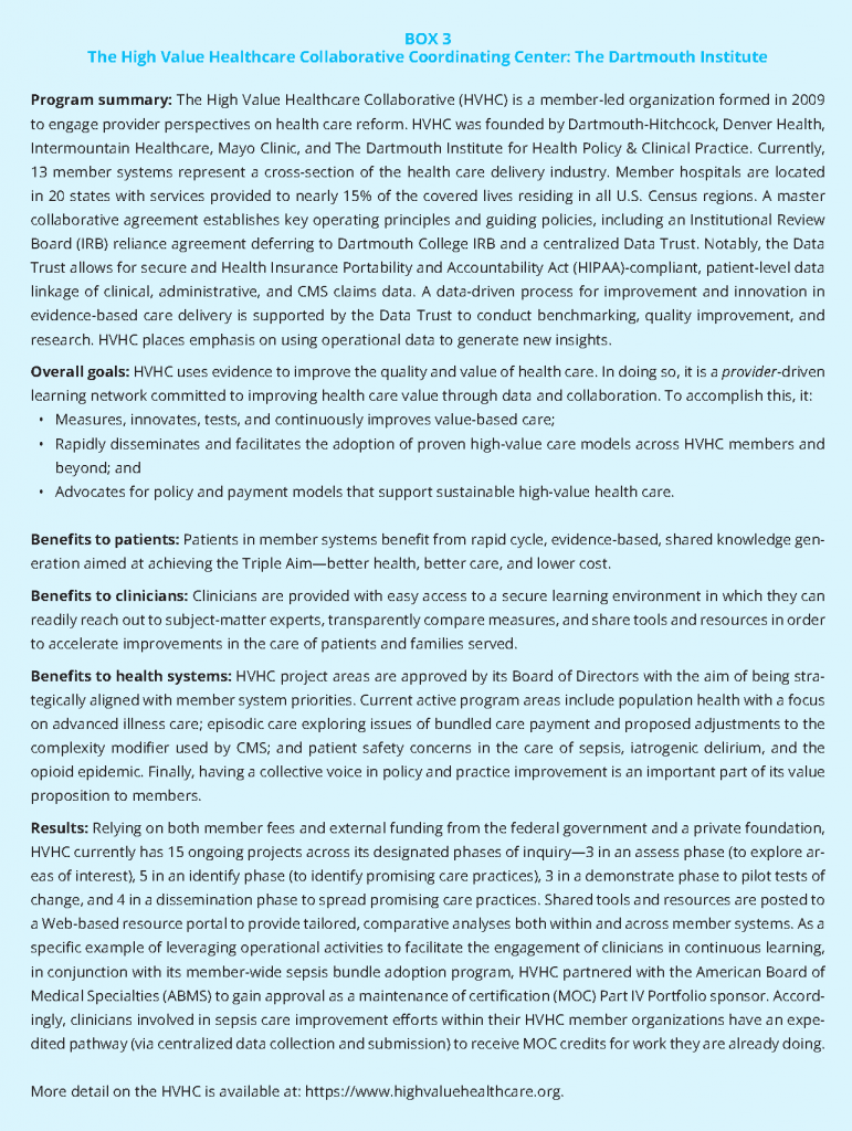 The delivery of care offers many opportunities, incentives, and challenges for front-line clinicians. Clinicians must balance increasing expectations for higher quality, performance measurement, and knowledge generation with the daily realities of their clinical practice. While most clinicians still operate under a fee-for-service payment model, there is a growing emphasis on shifting payment and care from volume-based care to value-based care. CMS has already surpassed its goal of having 30% of care supported through value-based payment by the end of 2016 (with a goal of 50% by 2019–2020) (Burwell, 2015). Delivery systems increasingly participate in value-based programs such as accountable care organizations, assume upside and downside financial risk for the care they deliver, and are rewarded for effective population management.