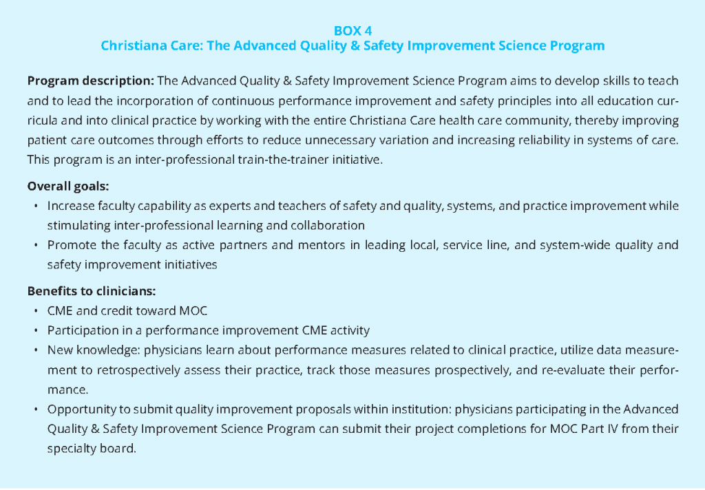 In order to incentivize clinician engagement in a continuously learning health system, clinical research data and quality improvement data collection should be embedded into the care delivery process and information should be gathered to serve multiple goals. Therefore, knowledge-generating initiatives should take into account existing reporting requirements and programs and reward the time and effort spent on learning activities to fulfill other requirements (e.g., providing continuing medical education [CME] credit, contributing to specialty certification, satisfying MACRA, and similar obligations) (see Box 4). They should also consider other ways the learning activities could provide additional incentives such as co-authorship or acknowledgment (based on their roles) in publications and research proposals.