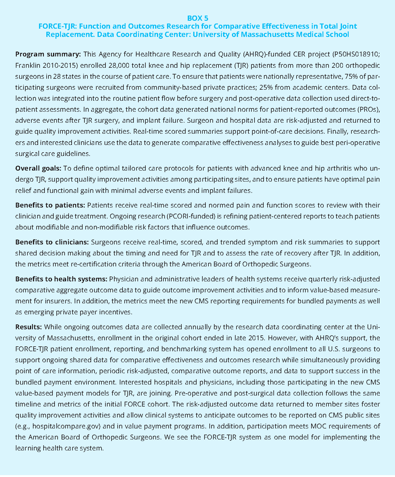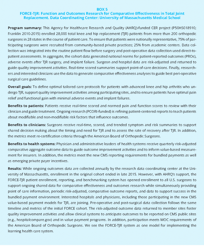 Clinicians—as members of research and quality improvement (QI) teams or as data contributors or when referring their patients for studies—need to receive something that improves how they care for their patients in return for their participation. This requires more than sharing new knowledge with them. Potential added benefits include more rapid implementation of positive results, comparative data to document their own outcomes and identify opportunities for improvement, and the great experience using, albeit slowly, EHR systems as tools for learning. To begin to address the misalignment of value-based incentives, efforts should be focused on reframing the concept of “findings” so that researchers and quality assessors work in collaboration with clinicians to learn what results from the data (e.g., risk and outcomes profiles, population-based data on their patients) would be useful and could be shared with them prior to the publication of a paper or a report. As an example, in an effort to make “evidence” more immediate and actionable for clinicians, the Function and Outcomes Research for Comparative Effectiveness in Total Joint Replacement and Quality Improvement (FORCE-TJR) research cohort assures that data submitted from consenting patients secondarily meet bundled payment program requirements (see Box 5) and return point of care evidence to inform care decisions (Franklin et al., 2012). After data capture, researchers provided clinicians and patients immediate data to guide individual care based on both aggregate local and national evidence as well as aggregate data to meet MIPS/APM criteria.