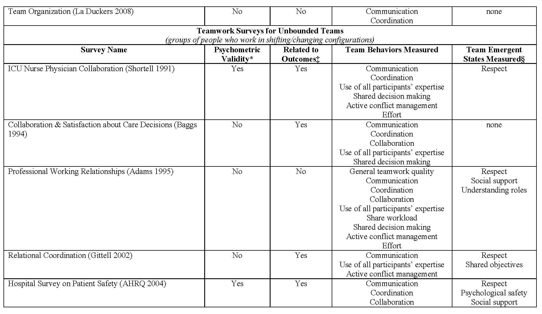 In addition to measuring the satisfaction of patients and other team members (which are indirect measures of team functioning), engaging in routine, frequent, meaningful evaluation of team function per se allows team members to improve their skills to fulfill the other principles of team-based care. A number of tools have been developed to directly assess the functionality of teams. Two measures mentioned by teams we interviewed include the Team Development Measure (teammeasure.org) and TeamSTEPPS questionnaires. Valentine and colleagues have produced a review of team measurement tools applicable to health care; a summary table of these tools, reproduced with permission, is available in the Appendix. [41] Despite the availability of team measurement tools, there is room for improvement in measurement of teamwork, since current measures look at various aspects of teamwork, few of them are robustly validated, and many are not routinely applied to teams in practice.