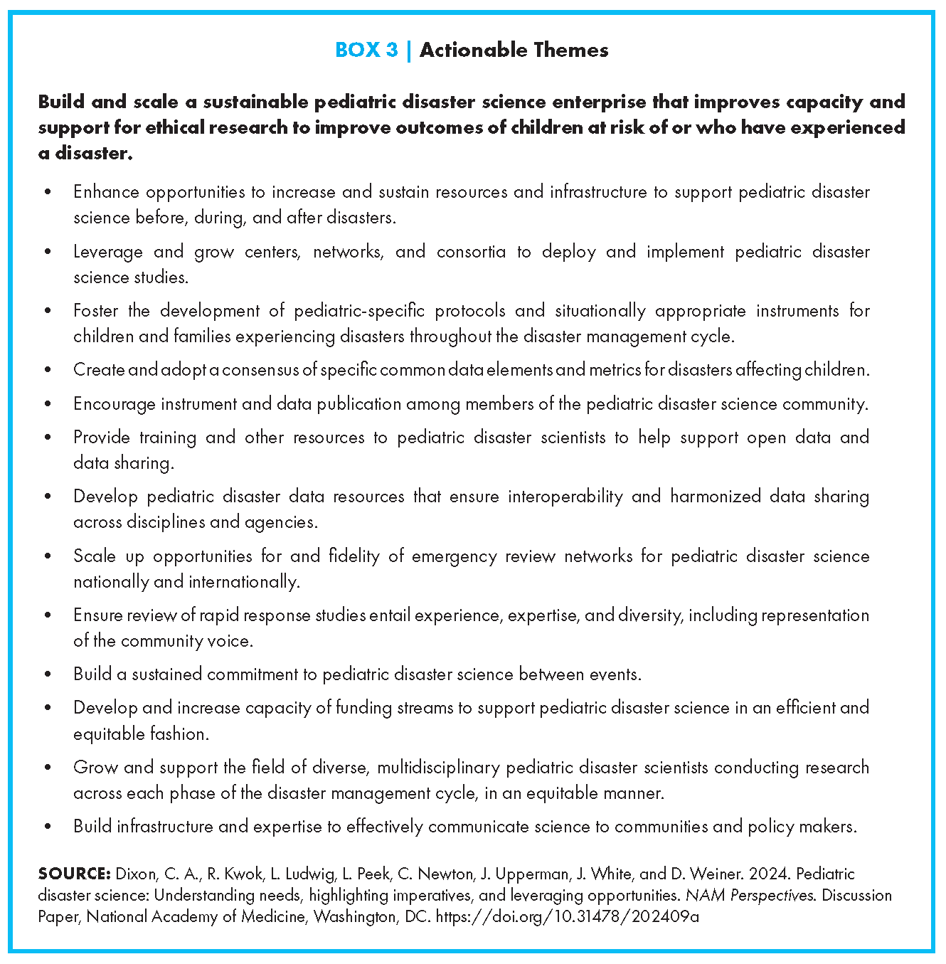 The pediatric disaster science enterprise will benefit from synergistically leveraging existing infrastructure, developing the workforce, and building sustainable research capacity that supports pediatric disaster science for all hazards, in an integrated and transdisciplinary fashion. This includes foundational work in pediatric-specific disaster science protocols, instruments, processes, and resources; ensuring ethical approaches while operationalizing unique and time-sensitive science; harnessing activities across centers, networks, and consortia to develop and maintain data capacity; strengthening pathways for inclusion and equity among pediatric disaster scientists; and understanding federal funding sources and policy. Consideration of a framework that organizes these entities and activities at the national, state, and local level would be beneficial. Box 3 provides associated Actionable Themes.