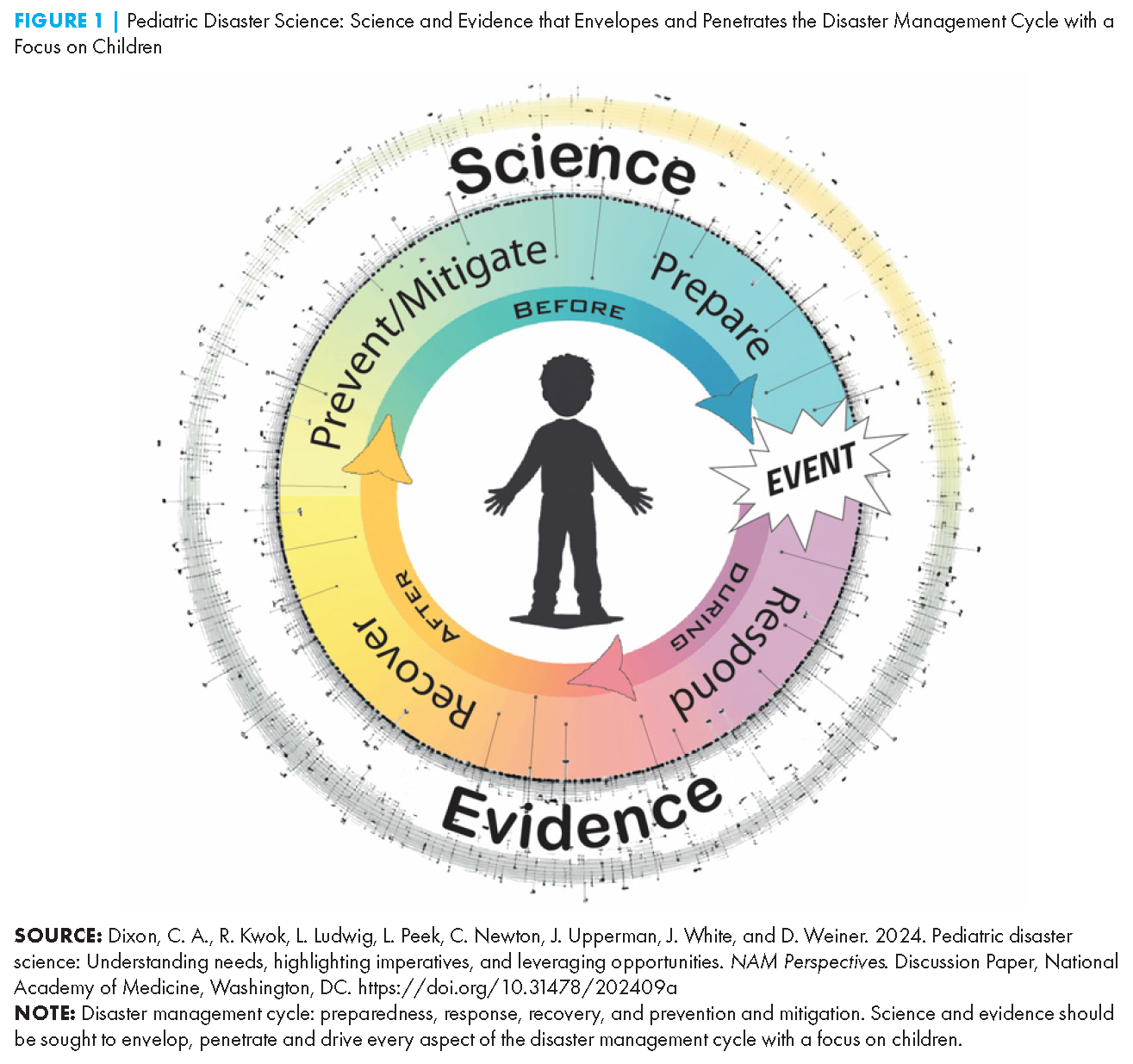 Disasters are increasing in frequency, complexity, and scope (EM-DAT, 2024; NCEI, 2024; UNDRR, 2022). Moreover, the designation between “human-induced” and “natural disasters” is not straightforward. A marked driver of the current increase in the number of disaster events per year is human-caused global climate change, which has transformed the global risk landscape for hurricanes and other tropical cyclones, severe storms and tornadoes, flooding, wildfires, landslides, infectious disease threats, severe heat and cold events, and droughts (USGCRP, 2024). Aging infrastructure, technological systems, increasing climate risks, and population changes have resulted in more frequent and severe events. Intentional disaster threats, such as incidents of mass violence and conflict, have also increased (Gramlich, 2023; United Nations, 2020). Pediatric populations are a focus of increased risk and concern for all these events, as well those of chemical, biological, radiological, and nuclear (CBRN) incidents, which have exponential risk of harm given the potential for increased pediatric dose exposure and long-term effects of exposure (Chung et al., 2020). This accelerating risk environment demonstrates a pressing need to prioritize investments and strategic interventions for children and an imperative for a rigorous science that yields an evidence base across the disaster cycle.