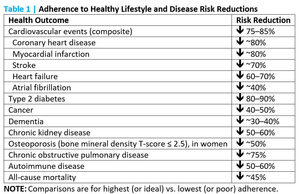 Modifiable lifestyle factors are profoundly powerful in maximizing health span and lifespan. Numerous long-term epidemiologic studies provide compelling evidence that self-care behaviors, such as being physically active, eating a nutritious diet, maintaining a healthy weight, not smoking, avoiding excessive alcohol intake, and getting sufficient sleep, are critically important for maintaining cardiometabolic health (e.g., favorable lipid, glucose, and blood pressure levels). Moreover, these factors have been linked to a lower risk of developing coronary heart disease (CHD), stroke, heart failure, cancer, type 2 diabetes, dementia, and other chronic conditions (Table 1), as well as to slowing of biologic aging (as reflected in biomarkers such as DNA methylation, the epigenetic clock, and telomere length).